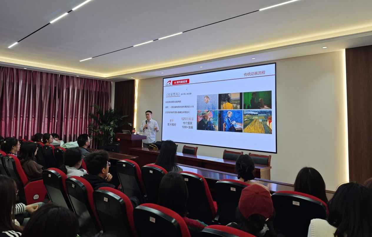 在讲座中,艾胜英教授以产业迭代为主线,系统剖析了AIGC技术驱动下影视动画产业从传统模式向智能化转型的核心逻辑。他指出,传统动画产业以劳动密集型生产为核心,面临成本高、周期长、创新瓶颈突出等痛点;而AIGC技术的快速发展,正通过AI辅助角色设计、场景生成、动画制作等环节,为产业带来效率提升、流程优化与创作边界拓展的全新可能。艾胜英教授结合行业数据与实践案例,解读了当前AI视频领域的主流创作模式及其应用场景。他表示,AI并非简单替代传统创作,而是为动画产业注入科技动能,推动产业结构优化与生态重构,为中国动画实现“弯道超车”提供了新机遇。同时他也提醒,AI技术对创作者的艺术审美、叙事能力与版权意识提出了更高要求,如何平衡技术应用与艺术表达,是行业发展与人才培养需要共同面对的课题。报告内容丰富、视野开阔,学生反应热烈。